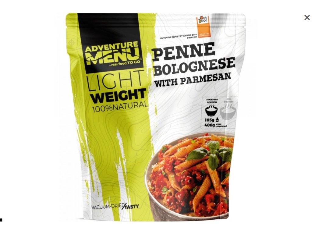 Pravá chuť Itálie v tvém batohu. Těstoviny penne z tvrdé pšenice s tradiční Boloňskou omáčkou s mletým hovězím a vepřovým masem, rajčaty, mrkví a petrželí, podlitá dobrým červeným vínem. Samozřejmě nechybí pravý Parmesan. Buon appetito.